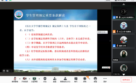 会议议程第二项,学院党委副书记颜学俊对学校及学院相关管理制度进行介绍,颜书记着重选取《威廉中国官方学籍管理》中部分内容做了详细解读。随后,颜书记又对学生来校途中及报到后在校期间的管理做出各项安全提示。会议议程第三项,学院2020级辅导员张颖旭针对学生返校前的准备工作及新生报到流程作出详细说明,并且对家长关心的宿舍问题,军训安排等做出详细解答。