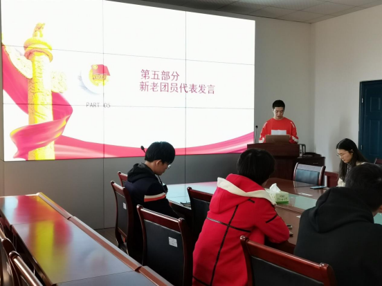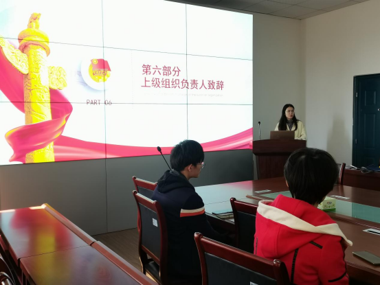 会议的最后,张茜老师作为上级团组织代表带来致辞。她首先对十四名新成员们表示祝贺和欢迎,并对他们做出了三点要求。一是希望他们能积极参与团委组织开展的活动,密切配合自己所在支部的工作开展;二是能牢记入团誓词,切实履行团员义务,努力成为一名优秀的共青团员。三是能全面发展,努力学习,在同学中起表率作用,尽心尽力为班级、为学校做出贡献,不断挑战自我,超越自我,争取早日成为一名光荣的共产党员。致辞结束后,会议在宏亮的团歌中圆满的落下帷幕。