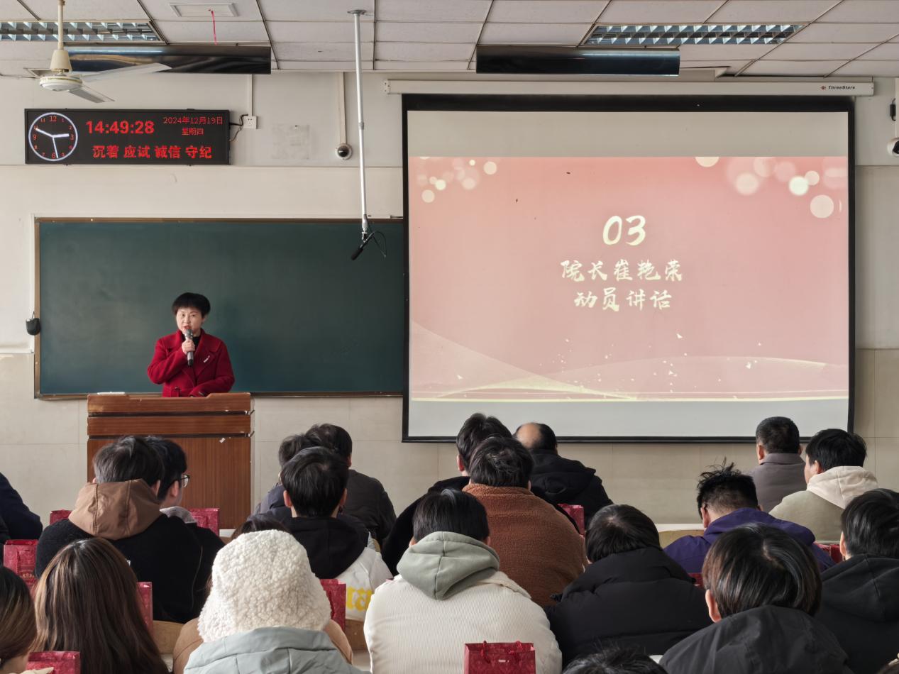 崔院长为考研学生作动员讲话。她对同学们的努力与付出给予了充分的肯定,路阻且长,行则将至,希望同学们保持乐观坚韧,以积极心态备考,坚定信心、全力以赴、沉着应考。接下来,崔院长为学生代表发放“考研大礼包”,并送上温暖祝福和鼓励。