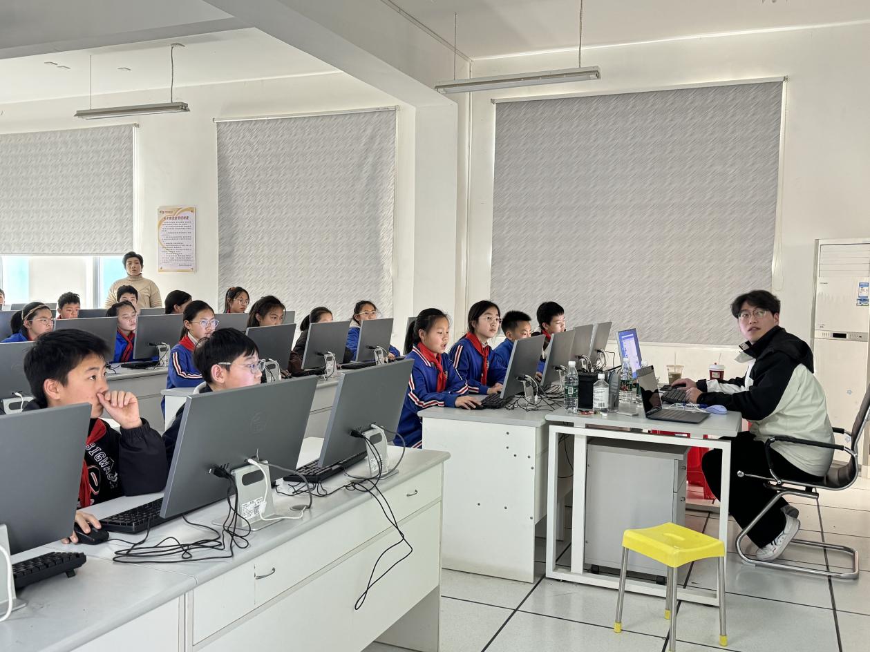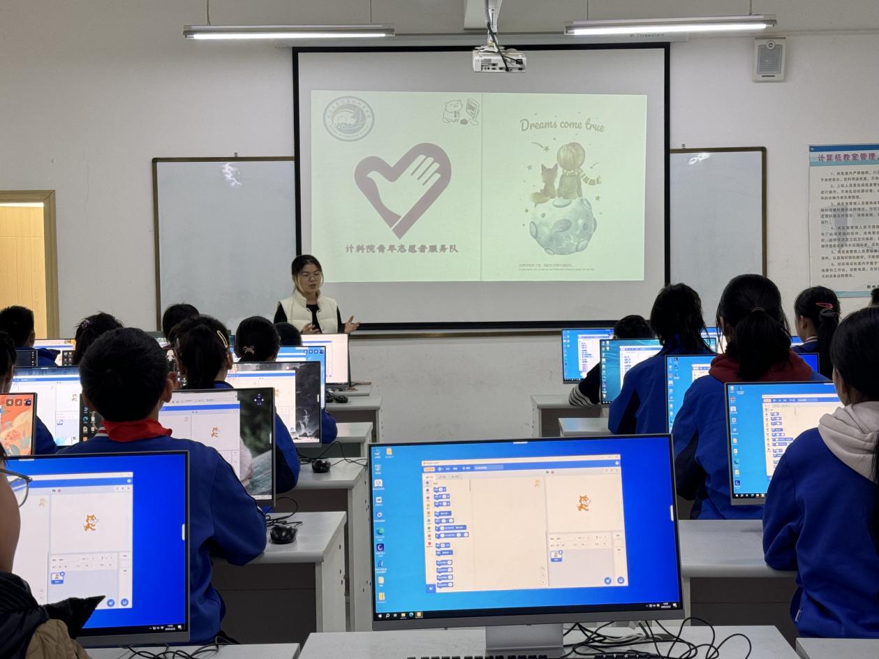 活动伊始,志愿者成贝尔迅采用通俗易懂的语言,借助趣味十足的动画和生活中的实例,将抽象概念具象化为可触摸的思维游戏。当看到通过代码实现小坦克自由移动并发射子弹的演示时,孩子们眼中闪烁着好奇的光芒,课堂里顿时响起此起彼伏的惊叹声。“编程是不是很难呀?”“机器人是不是都要靠编程来控制呢?”面对这些天真烂漫的问题,志愿者们结合 Scratch 软件操作界面,用“代码积木”的比喻形象解释编程逻辑,鼓励孩子们勇敢尝试基础代码编写。