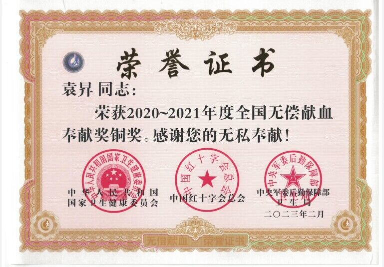 2023年,国家卫生健康委、中国红十字会总会、中央军委后勤保障部卫生局颁布《关于表彰2020-2021年度全国无偿献血表彰奖励获奖者的决定》,我院2021级学生袁昇荣获全国“无偿献血奉献奖铜奖”。