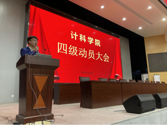 会上,计科32007班的蔡鸿宇同学带领同学们进行了备战四级暨诚信考试宣誓。