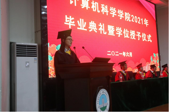 随后,学院本科生、研究生毕业代表依次上台发言。董阿兵谈到了这四年来大家的进步:我们努力践行“长大长新”的校训,学会了去求知,去探索,去宽容,不断超越,不断成长;卞珍怡回顾了在校历程,并深深地感谢父母、感谢导师、感谢同学;胡月像论文一样给自己三年的时光添加了两个关键词—“不舍”、“感激”,表达了自己对母校深深的眷念之情。