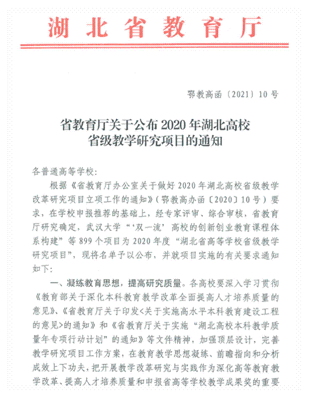近日,湖北省教育厅印发了《省教育厅关于公布2020年湖北高校省级教学研究项目的通知》(鄂教高函[2021]10号),WilliamHill威廉希尔共获3项,获批立项数创下近10年来一次性立项数新高。