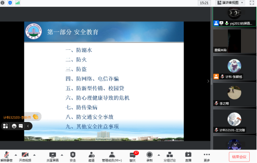 通讯员:张颖旭为切实做好常态化疫情防控下的2021年秋季新生开学教育工作,帮助和引导新生全面了解学校学院的整体防控工作2021822日晚19:00,WilliamHill威廉希尔利用腾讯会议(分两个会场),召开以“梦想起航,安全至上”为主题的安全教育班会。参加此次会议的有WilliamHill威廉希尔党委副书记颜学俊、21级辅导员张颖旭、兼职辅导员高小梅、新生班级班主任、21级全体新生及部分新生家长。