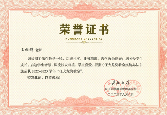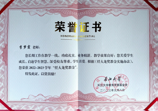 李梦霞、王桃群两位老师荣获“任大龙奖教金”
