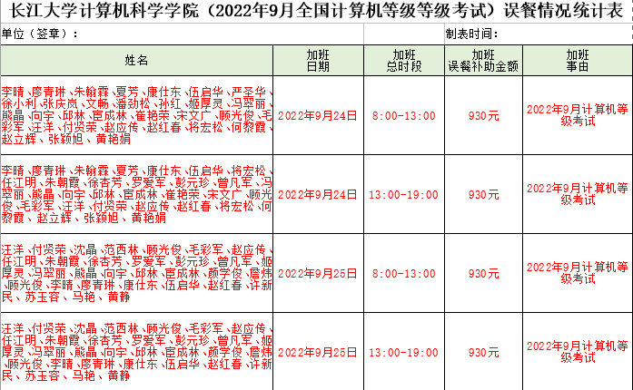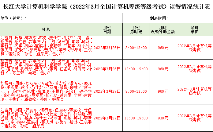 2022全国计算机等级考试工作加班(值班)误餐情况公示